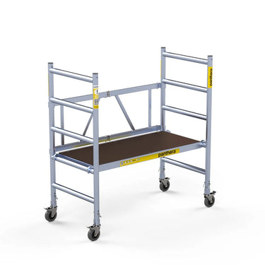 Vanaf 4 meter werkhoogte is het van belang om te kiezen voor een platform met luik, zodat u aan de binnenkant van de steiger omhoog kunt klimmen. Al onze kamersteigers vanaf 4 meter werkhoogte zijn standaard uitgevoerd met een platform met luik. De kamersteiger is uit te bouwen tot een werkhoogte van max. 7.5 meter.
