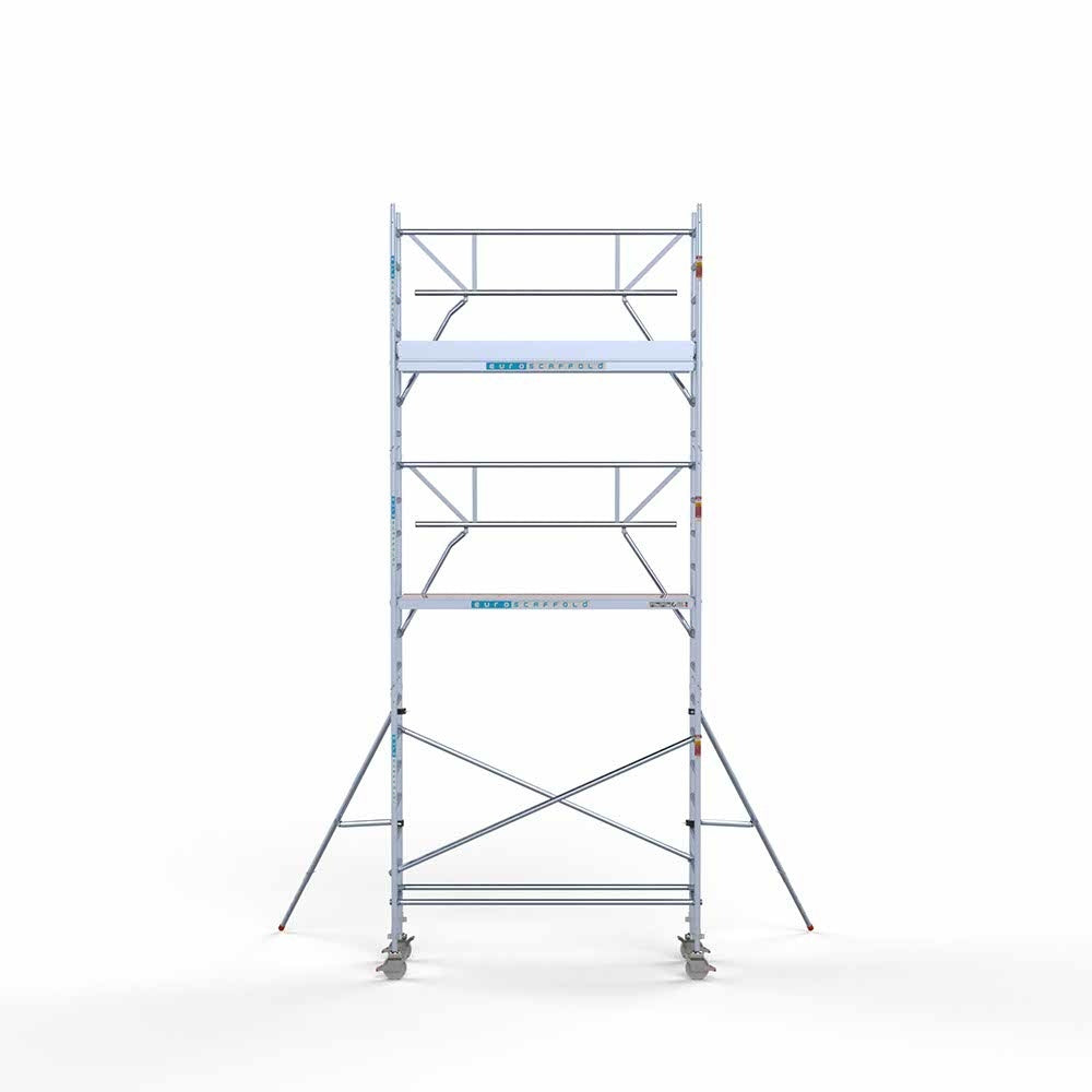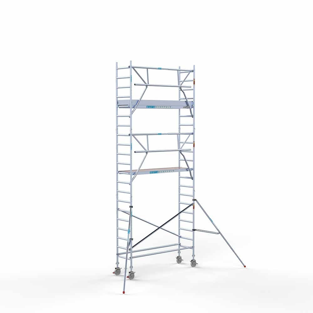 Zeer complete professionele rolsteiger met een breedte van 75 cm, lengte van 250 cm en een werkhoogte van 7,2 meter inclusief montagesysteem. Met dit montagesysteem bent u beschermd tijdens het op- en afbouwen tegen valgevaar.